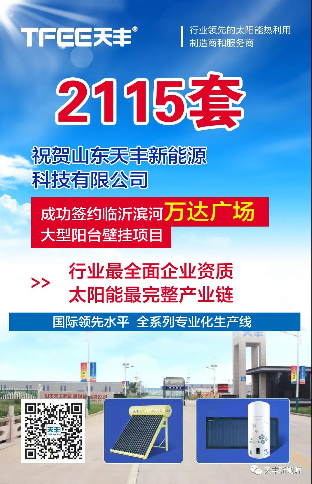 近日,天豐新能源工程部再傳捷報,通過與各品牌的激烈角逐,一舉斬獲臨沂濱河萬達廣場大型陽臺壁掛工程項目,陽臺壁掛太陽能熱水器數(shù)量達2115套,為近20座高層住宅提供舒適熱水,這將成為天豐在樓盤配套陽臺壁掛工程領域的又一經典力作。