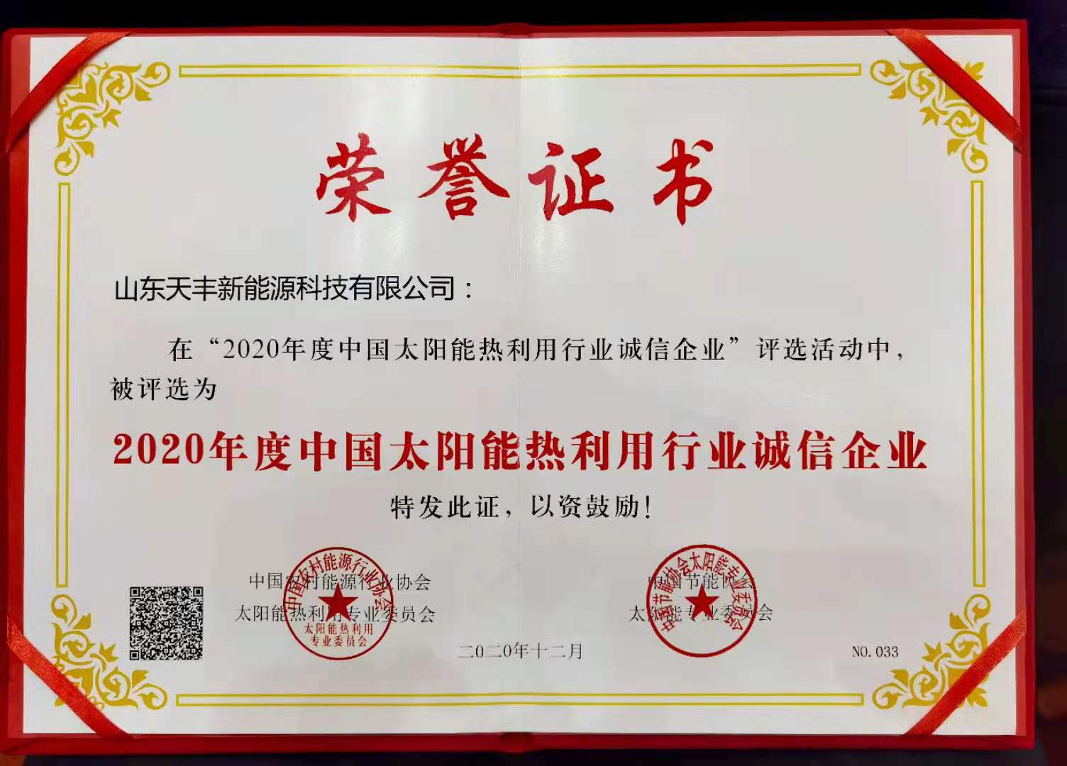 12月8日,2020年中國太陽能熱利用行業(yè)年會在邢臺召開,山東天豐新能源科技有限公司受邀參加本次會議,在會上,天豐新能源再度蟬聯(lián)“中國太陽能熱利用行業(yè)誠信企業(yè)”稱號,并獲頒榮譽(yù)證書。