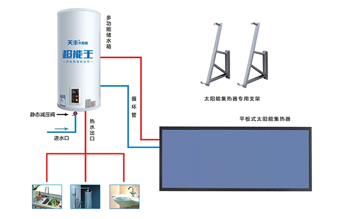 本系統(tǒng)采用天豐陽臺(tái)壁掛分體式太陽能熱水機(jī),吸熱部件(太陽能集熱器)與儲(chǔ)熱部件(水箱)分離式安裝,集熱器安裝于南面陽臺(tái)上,儲(chǔ)熱部件(水箱)安裝于室內(nèi)陽臺(tái)上,然后通過管路把太陽能集熱器、水箱和室內(nèi)衛(wèi)生間、廚房等用熱設(shè)備相連接的一種分戶集熱、分戶儲(chǔ)熱式太陽能熱水系統(tǒng),整個(gè)系統(tǒng)為承壓式運(yùn)行,間接加熱。