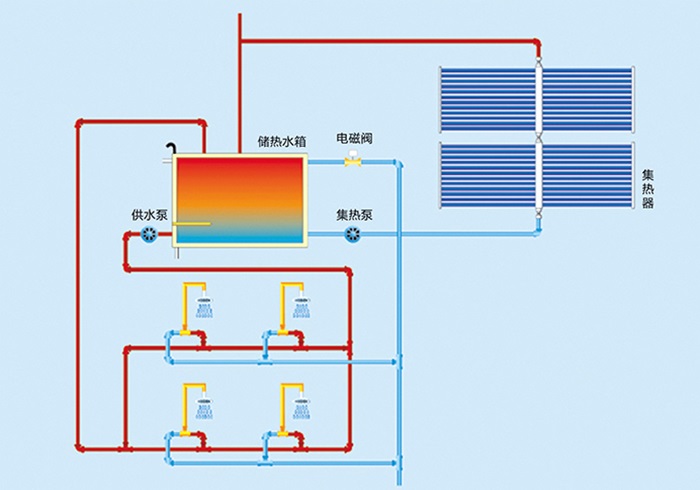 室外(屋面、空地等)安裝大面積的太陽能集熱器矩陣吸收太陽能量,并將光能轉化成熱能后集中儲存在儲熱水箱